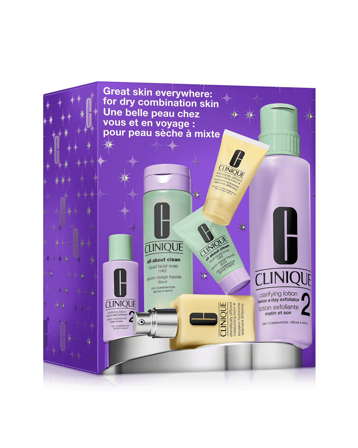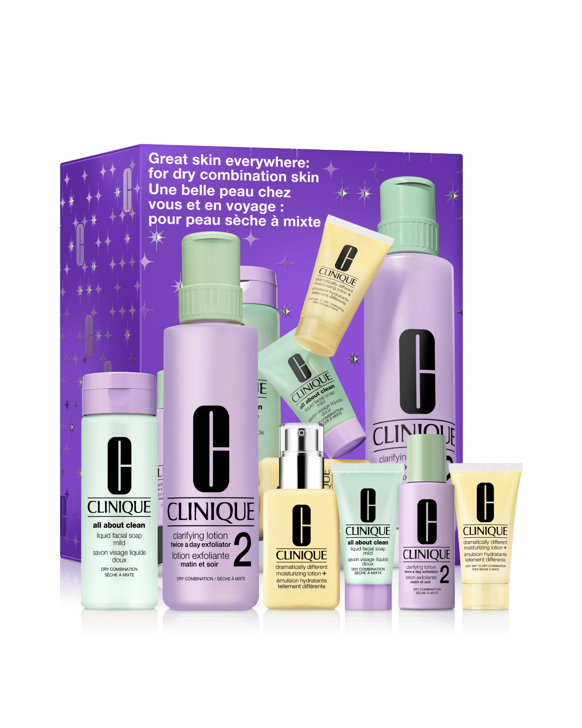 Clinique’s signature 3-Step Skin Care System for healthy-looking skin—one set for home, one for travel. Customised for drier skin types. A $340 value.