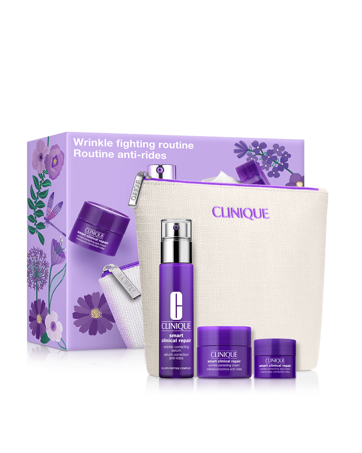All set to outsmart wrinkles. Our smart de-ageing trio includes a powerful wrinkle cream, eye cream, and full-size serum. All in an exclusive bag.