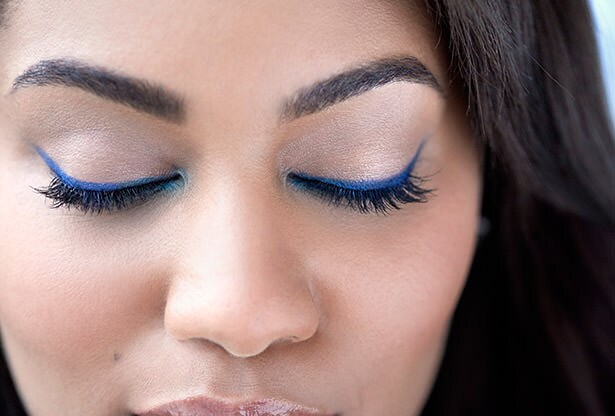 To get Sunina's look: First, line your upper and lower lash lines with a navy blue eyeliner, like Skinny Stick in Skinny Jeans. Next, use an angled brush to sweep Lid Pop in Aqua Pop from your lash lines up towards your creases and extend the shadow past your outer lashes to create the cat eye flick. Blend the dark blue liner and azure shadow to create an ombré effect. This trend is all about the eyes, so Sunina went for a bold brow and jet-black mascara, and kept her lips neutral but full of dimension by layering two shades of sparkling pink: Long Last Glosswear in Bamboo Pink and Air Kiss.